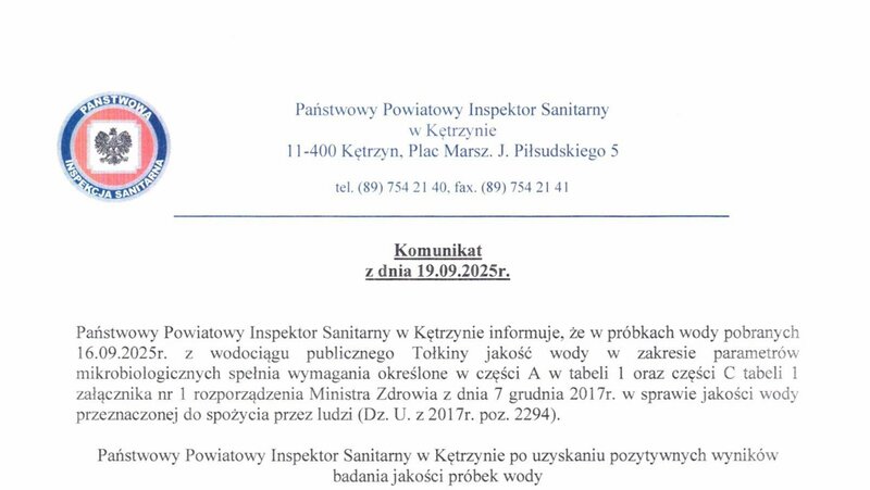 Komunikat PPIS dnia 19.09.2025r. dot. przydatności wody przeznaczonej do spożycia przez ludzi w wodociągu publicznym Tołkiny